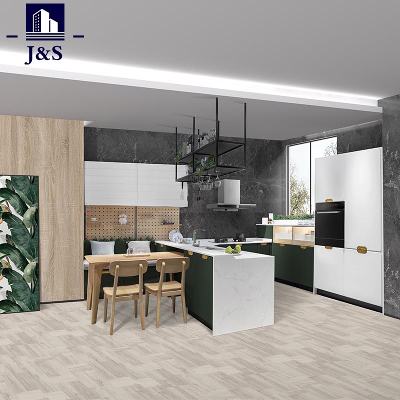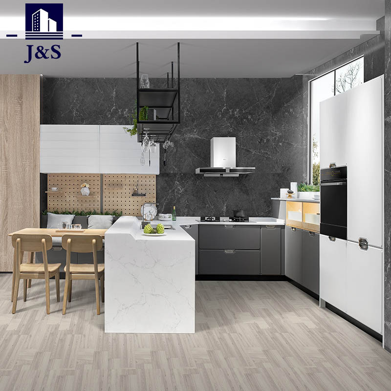 J&S постачає нову дизайнерську матову білу кухонну шафу, це акрилова дверна кухонна шафа. Акрилові дверні панелі використовуються для гарної прозорості, оскільки цей тип дверних панелей виготовлений з безбарвних і прозорих пластин з оргскла, а його пропускна здатність може досягати більше 92 %, досягаючи дзеркального ефекту та візуально розширюючи простір кухні.